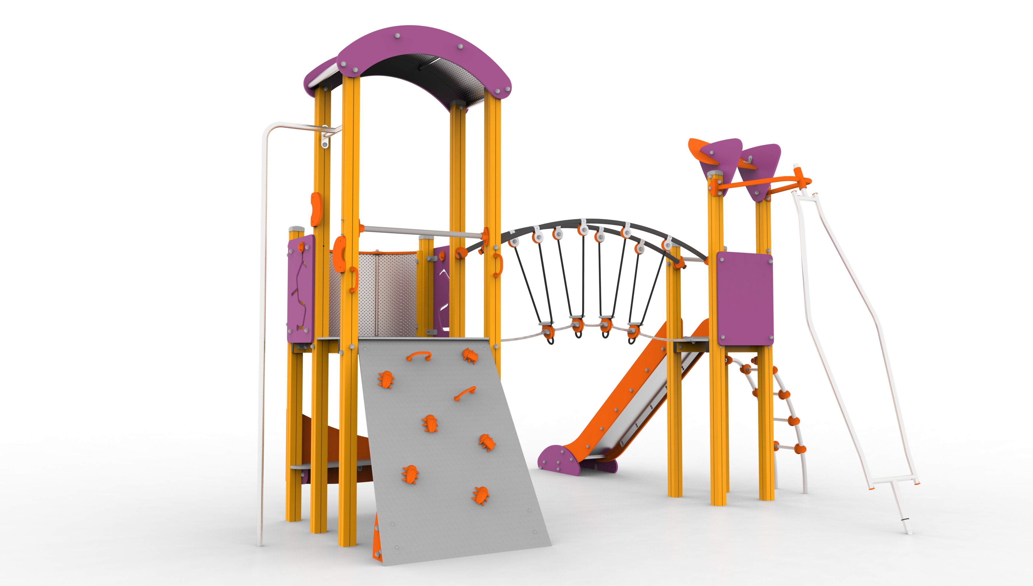 From a theoretical point of view, Fusión is our most eclectic range. It is a transition design, aimed to meet the needs of children of different ages, thus increasing and varying the possibilities of play. For this reason, we opt for the geometry of triangles, circles and squares, which refers us back to the basic forms of construction games, while opening new possibilities through abstract interpretation. The color opens up to a more elaborate palette, suitable for all ages and elegantly integrated into urban environments. The range has the possibility of opting for wooden or aluminum posts. The familiar elements acquire greater complexity, with climbing walls, suspended walkways or nets. Also, they can be combined with several types of swings included in the Complementos range. Halfway between mechanical devices and the typical elements of an adventure story, Fusión demands a greater degree of attention to its users. The game ceases to be an almost automatic activity for the child and becomes a reinforcement of self-esteem with the spirit of reaffirmation. Also, and as a novelty, there is the alternative of incorporating rotational molding slides, instead of the traditional slide made of stainless steel.