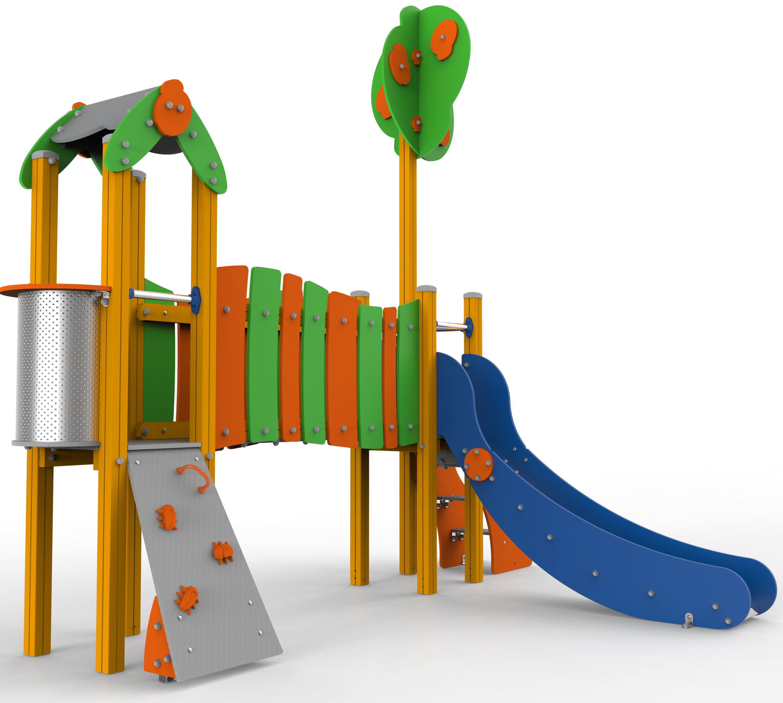 The Cómic range is a good example of how we put into practice our guiding principle, that pedagogy has to shape design. In Galopín, pedagogy comes first, and Cómic is a range designed to accompany all the stages of child development, from early childhood to the age of 14. With this as our starting point, Cómic presents a set of games based on a simple and attractive design that adapts effortlessly to a child’s evolution. To reinforce their learning capabilities, this range uses a formal language similar to that which they find in school activities, or in the books and toys they have at home. Outdoor play, especially during early childhood years, must be integrated into the learning process and reinforce it in a harmonious way. For the older kids, Cómic offers structures with nets or fireman’s poles. It can also be combined with the wide variety of swings. Using primary colors and offering the possibility of wood or aluminum posts, combined with a simple, figurative design, Cómic familiarizes children with shapes such as those of animals or houses, while offering them suitable spaces to interact with each other and advance in their process of socialization. Also, and as a novelty, there is the alternative of incorporating rotational molding slides, instead of the traditional slide made of stainless steel.