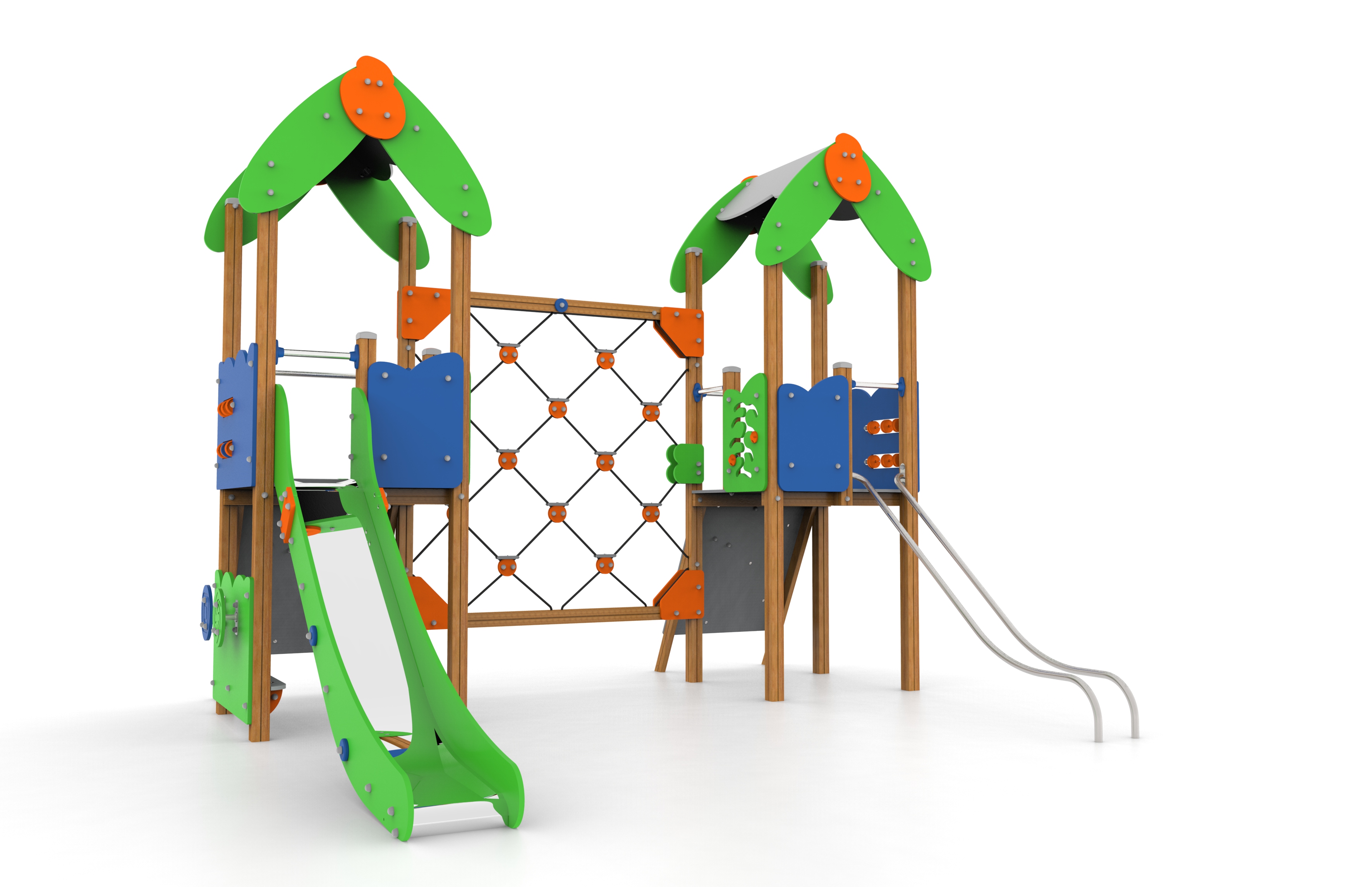 The Cómic range is a good example of how we put into practice our guiding principle, that pedagogy has to shape design. In Galopín, pedagogy comes first, and Cómic is a range designed to accompany all the stages of child development, from early childhood to the age of 14. With this as our starting point, Cómic presents a set of games based on a simple and attractive design that adapts effortlessly to a child’s evolution. To reinforce their learning capabilities, this range uses a formal language similar to that which they find in school activities, or in the books and toys they have at home. Outdoor play, especially during early childhood years, must be integrated into the learning process and reinforce it in a harmonious way. For the older kids, Cómic offers structures with nets or fireman’s poles. It can also be combined with the wide variety of swings. Using primary colors and offering the possibility of wood or aluminum posts, combined with a simple, figurative design, Cómic familiarizes children with shapes such as those of animals or houses, while offering them suitable spaces to interact with each other and advance in their process of socialization. Also, and as a novelty, there is the alternative of incorporating rotational molding slides, instead of the traditional slide made of stainless steel.