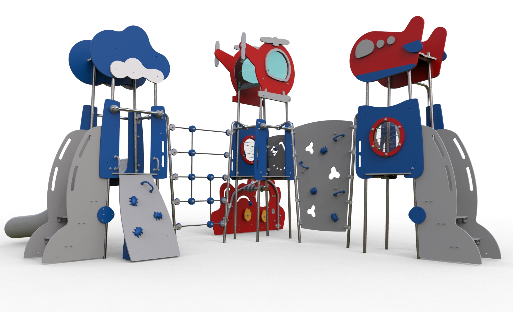 We do not always have the opportunity to plan an ideal park from scratch. Quite often, it is necessary to insert attractive solutions in small spaces, determined by the previous urban development. Minimalist arises as an answer to this type of situation, as proof that the simple does not have to be at odds with the functional, and that it is possible to offer maximum playability by combining a few elements with intelligence. The stairs evoke access to a space rocket; panels are set to house puzzles or mobile parts; the joints become climbing walls. With an harmonious design in which the game elements almost overlap one another and allow a great versatility of use. The color palette also acts as an intuitive chromatic guide that serves as an orientation for children: we go up or down by gray elements; we navigate between blue platforms guided by orange and white support points; green elements evoke plants and bushes. Because where space tries to limit play, the best solution is to convert the structure in part of the game. Also, and as a novelty, there is the alternative of incorporating rotational molding slides, instead of the traditional slide made of stainless steel.