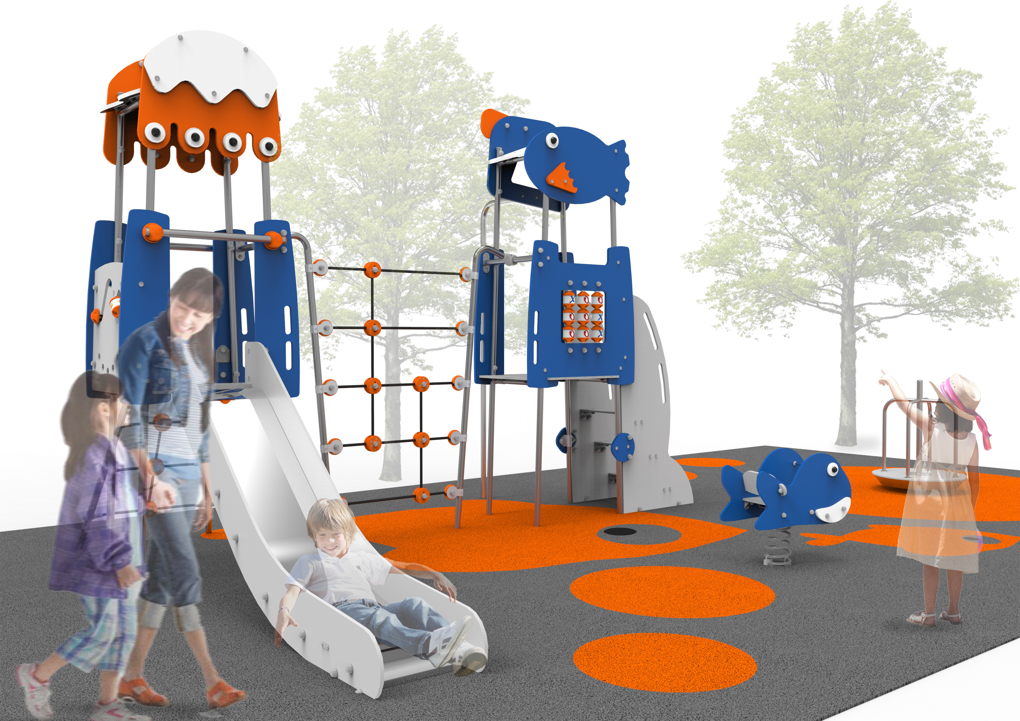Its play elements with figurative funny forms like jellyfish, fish, castles, etc. allow children to assume roles and create their own adventures.