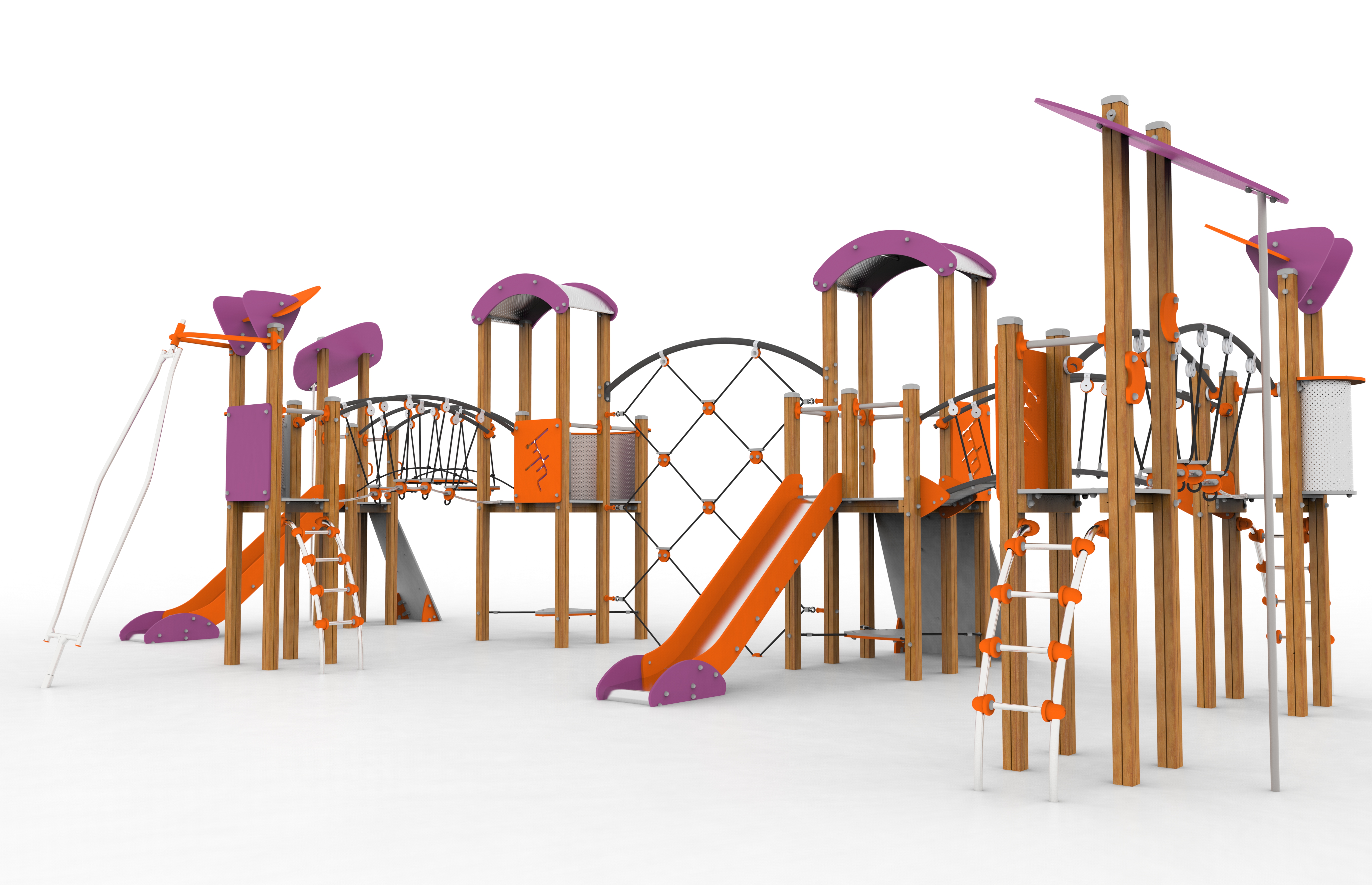 Desde un punto de vista teórico, Fusión resulta la más ecléctica de nuestras gamas. Se trata de una propuesta de transición, destinada a satisfacer las necesidades de juego de niños de edades diferentes, que apuesta por incrementar y variar las posibilidades de juego. Así, optamos por una geometría de triángulos, círculos y cuadrados, que remite a las formas básicas de los juegos de construcción pero abre nuevas posibilidades a través de la interpretación abstracta. El color se abre a una paleta más elaborada, atractiva para todas las edades y que se integra de manera elegante en los entornos urbanos. La gama cuenta con la posibilidad de optar por postes de madera o de aluminio. Los elementos conocidos adquieren mayor complejidad, con rocódromos, pasarelas sobre el vacío o redes. Y también puede combinarse con varios tipos de columpios incluidos en la gama Complementos. A medio camino entre los ingenios mecánicos y los elementos típicos de una historia de aventuras, Fusión reclama un mayor grado de atención a sus usuarios. El juego deja de ser una actividad casi automática para el niño y se convierte en un refuerzo de la autoestima y el espíritu de reafirmación. Además, y como novedad, se dispone de la alternativa de incorporar toboganes de rotomoldeo, en lugar del tradicional tobogán realizado en chapa de inoxidable.