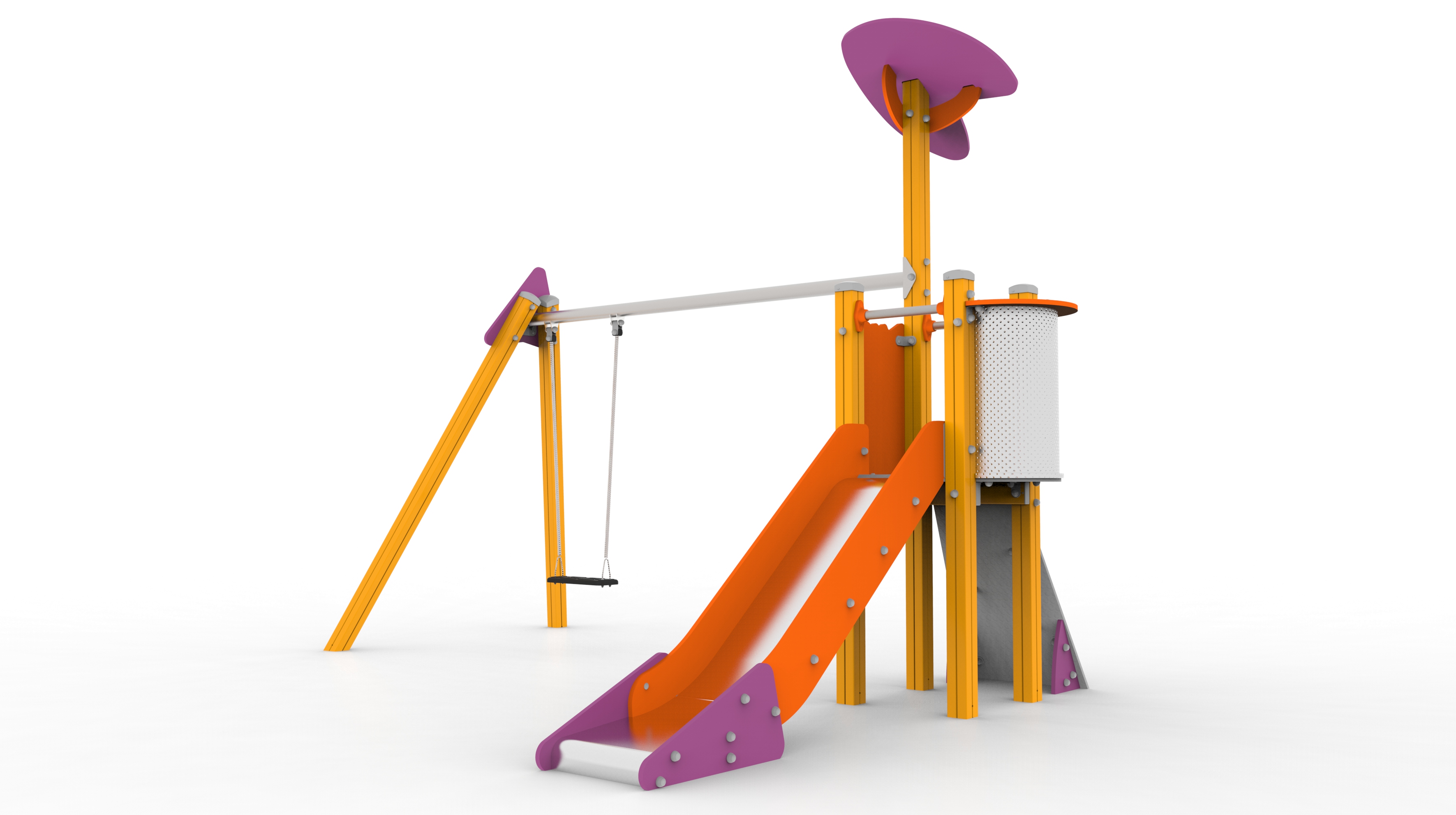 Desde un punto de vista teórico, Fusión resulta la más ecléctica de nuestras gamas. Se trata de una propuesta de transición, destinada a satisfacer las necesidades de juego de niños de edades diferentes, que apuesta por incrementar y variar las posibilidades de juego. Así, optamos por una geometría de triángulos, círculos y cuadrados, que remite a las formas básicas de los juegos de construcción pero abre nuevas posibilidades a través de la interpretación abstracta. El color se abre a una paleta más elaborada, atractiva para todas las edades y que se integra de manera elegante en los entornos urbanos. La gama cuenta con la posibilidad de optar por postes de madera o de aluminio. Los elementos conocidos adquieren mayor complejidad, con rocódromos, pasarelas sobre el vacío o redes. Y también puede combinarse con varios tipos de columpios incluidos en la gama Complementos. A medio camino entre los ingenios mecánicos y los elementos típicos de una historia de aventuras, Fusión reclama un mayor grado de atención a sus usuarios. El juego deja de ser una actividad casi automática para el niño y se convierte en un refuerzo de la autoestima y el espíritu de reafirmación. Además, y como novedad, se dispone de la alternativa de incorporar toboganes de rotomoldeo, en lugar del tradicional tobogán realizado en chapa de inoxidable.