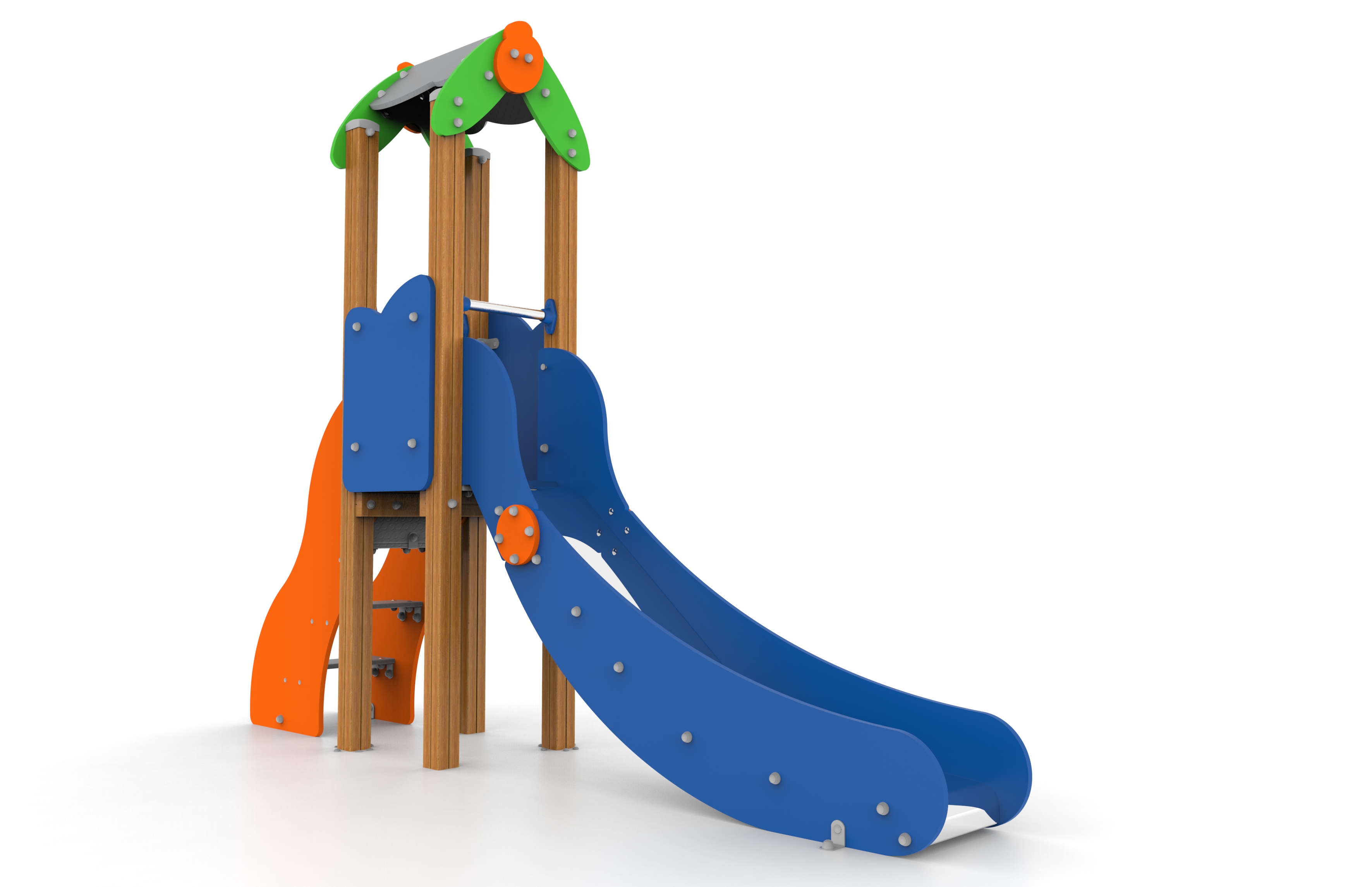 La gama Cómic es un buen ejemplo de aplicación de nuestro principio rector, que considera que la pedagogía debe guiar el diseño. En Galopín, la pedagogía es lo primero, y Cómic es una gama pensada para acompañar todas las etapas del desarrollo infantil, desde la infancia temprana hasta los 14 años. Con este punto de partida, Cómic presenta un conjunto de juegos basado en un diseño sencillo y atractivo, que se adapta sin esfuerzo a las etapas del desarrollo. Para reforzar su aprendizaje, esta gama recurre a un lenguaje formal similar al que los niños encuentran en las actividades escolares, o en los libros y juguetes que tienen en sus hogares. Porque el juego al aire libre, sobre todo en el arranque de la infancia, debe integrarse en los procesos de aprendizaje y reforzarlos de manera armónica. Para los más mayores, ofrece estructuras con redes o barras de bomberos. También se puede combinar con la gran variedad de columpios. Con sus colores primarios, la posibilidad de contar con postes en madera o aluminio, y un diseño figurativo sencillo, Cómic familiariza a los niños con formas como animales o casas, al tiempo que les propone espacios adecuados para interactuar entre ellos y avanzar en sus procesos de socialización. Además, y como novedad, se dispone de la alternativa de incorporar toboganes de rotomoldeo, en lugar del tradicional tobogán realizado en chapa de inoxidable.
