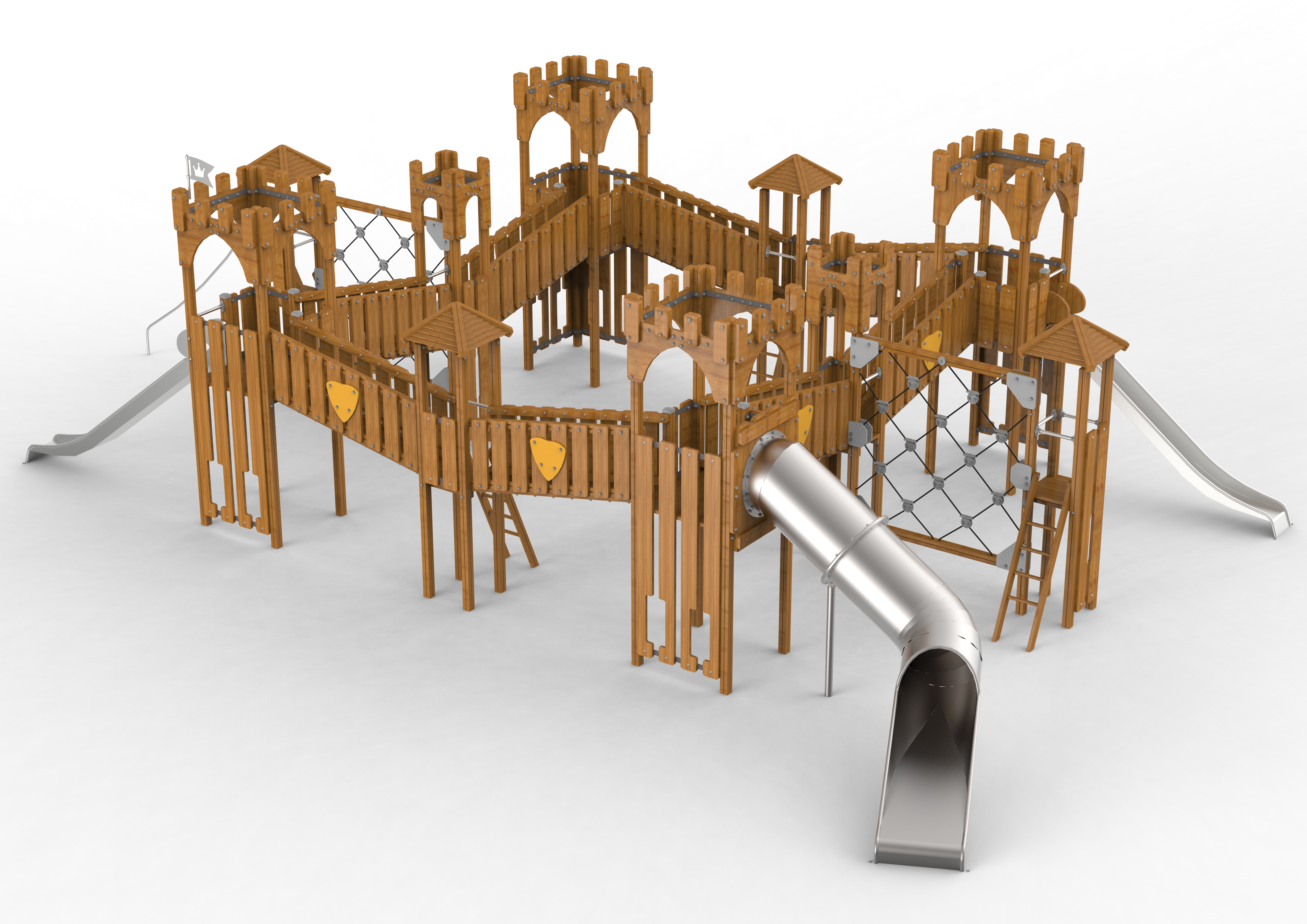 En Galopín tenemos una conexión innata con la madera. En su primera salida al campo, el niño agarra un palo y lo convierte en caballo, bastón, espada, jabalina... Además de estimular nuestra imaginación, la madera, elemento vivo, nos conecta con la naturaleza e impulsa la biofilia. Fuente de bienestar emocional, resulta imprescindible facilitar el contacto de este material con los menores. Elemento esencial en los nuevos conceptos de economía circular, la madera se pude reciclar indefinidamente, ayuda a reducir los gases de efecto invernadero y requiere poca energía para su transformación. Envejece dignamente con muy pocos cuidados y mantiene su robustez a lo largo de los años. Desde el principio manipulamos y tratamos la madera como lo haría un carpintero artesanal. Esta gama presenta tres variantes, que realzan el protagonismo del material. En Natura, los postes reciben un tratamiento que acentúa los perfiles rectos y el carácter constructivo. En la variante Robinia, el respeto a la forma circular pone en valor esta madera sostenible y nos transporta a mundos de aventura y fantasía. Finalmente, y como homenaje a la Naturaleza, Ecopark convierte el diseño en una herramienta para respetar el entorno, ya que con unos elementos mínimos –cuerdas, piezas de madera- se configuran juegos certificados que parecen surgidos como una prolongación de las formas naturales del bosque.