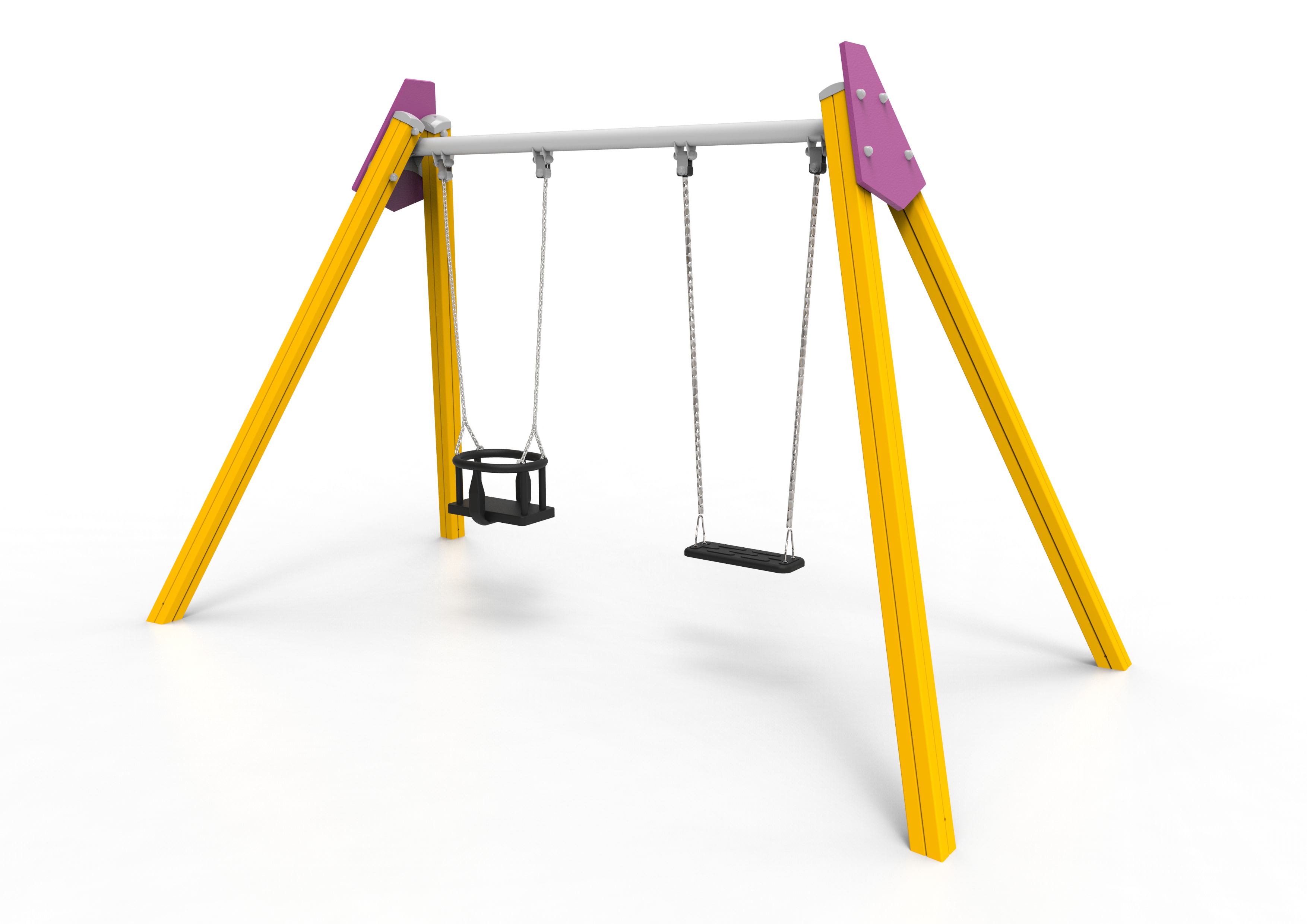 Desde un punto de vista teórico, Fusión resulta la más ecléctica de nuestras gamas. Se trata de una propuesta de transición, destinada a satisfacer las necesidades de juego de niños de edades diferentes, que apuesta por incrementar y variar las posibilidades de juego. Así, optamos por una geometría de triángulos, círculos y cuadrados, que remite a las formas básicas de los juegos de construcción pero abre nuevas posibilidades a través de la interpretación abstracta. El color se abre a una paleta más elaborada, atractiva para todas las edades y que se integra de manera elegante en los entornos urbanos. La gama cuenta con la posibilidad de optar por postes de madera o de aluminio. Los elementos conocidos adquieren mayor complejidad, con rocódromos, pasarelas sobre el vacío o redes. Y también puede combinarse con varios tipos de columpios incluidos en la gama Complementos. A medio camino entre los ingenios mecánicos y los elementos típicos de una historia de aventuras, Fusión reclama un mayor grado de atención a sus usuarios. El juego deja de ser una actividad casi automática para el niño y se convierte en un refuerzo de la autoestima y el espíritu de reafirmación. Además, y como novedad, se dispone de la alternativa de incorporar toboganes de rotomoldeo, en lugar del tradicional tobogán realizado en chapa de inoxidable.