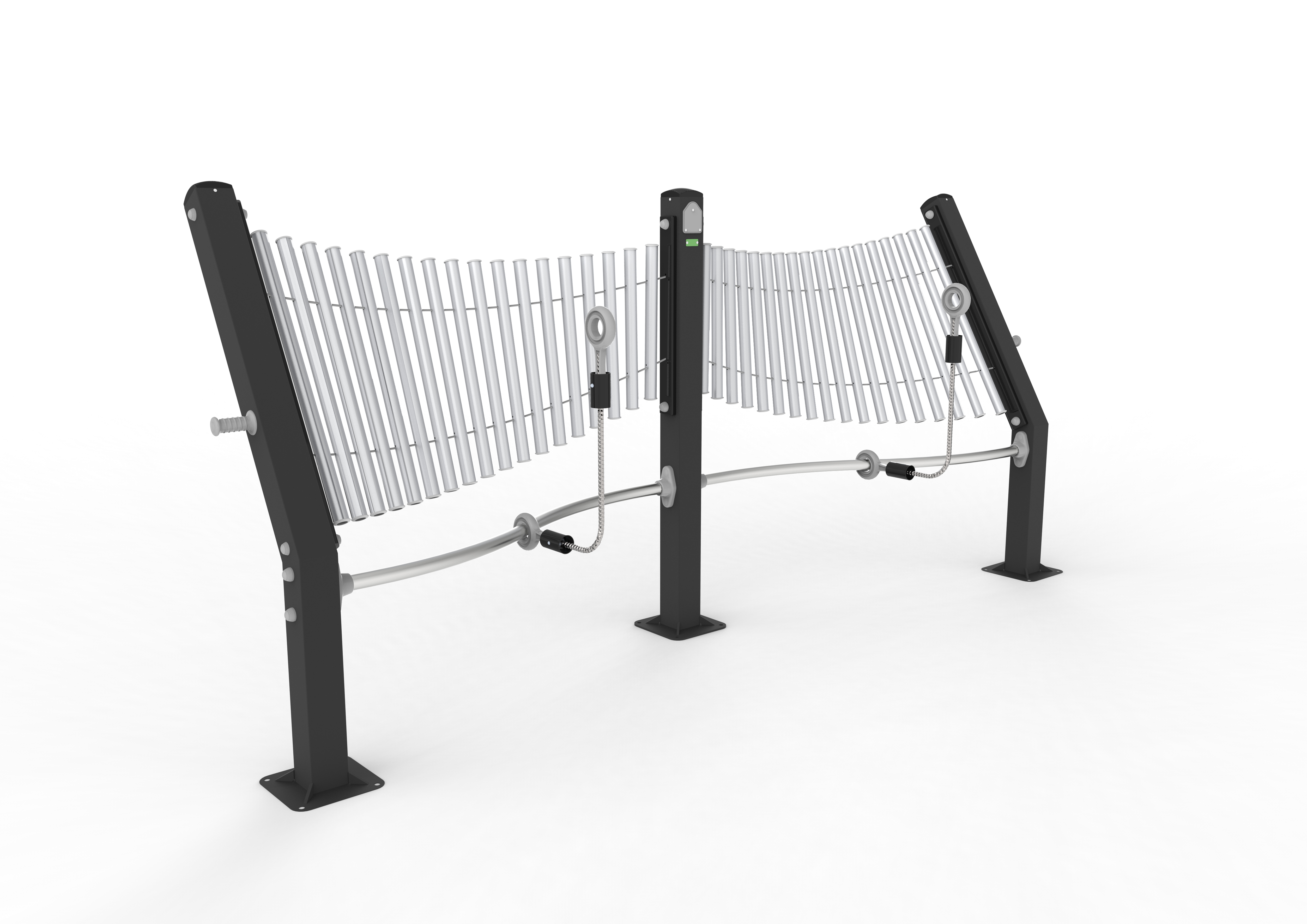 En la gama Creativos, los juegos permiten a los niños ejercitar su creatividad a través del contacto con elementos como el agua, la arena o el sonido. Los juegos de agua invitan a los usuarios a disfrutar con las corrientes y remolinos que forman pequeños cursos de agua que discurren por canales, impulsan hélices, llenan recipientes... Realizados en madera y acero inoxidable, los juegos recuerdan las formas de la minería o los molinos, a la vez que los introducen en las nociones físicas de potencia, presión, velocidad... Los areneros forman un territorio especial en el que el niño, a través de la imaginación, puede jugar a transformar su entorno. Excavar la arena, levantar montañas, construir castillos, trazar circuitos para coches... La arena forma un paisaje cambiante, en dos y tres dimensiones, que el niño modula ejercitando su sentido de la plasticidad, su capacidad motriz y su creatividad. Además, un arenero es siempre un espacio a compartir, un entorno que genera sus propias propuestas de convivencia y juego libre. El ruido de un parque es el sonido de la diversión y de la socialización puestas en marcha pero los elementos musicales representan un reto diferente. El primer golpe en un tambor es una ampliación de esa fabulosa cacofonía. Pero en cuanto esos golpes se dejan guiar por el ritmo, lo que solo era estruendo se convierte de pronto en música. Cada una de las láminas de un xilófono ofrece una nota diferente con las que crear un número infinito de combinaciones. El niño descubre así que también puede “construir” música. Lenguaje a la vez complejo y sumamente sencillo, susceptible de aprendizaje intelectual y elemento innato al ser humano, la música resulta un elemento ideal para fomentar el juego en grupo y la relación entre niños de diferentes edades o capacidades.